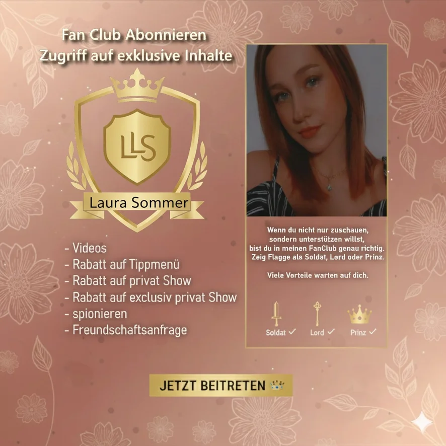 Kommt in meinen Fanclub als Soldat, Lord oder Prinz und bekommt exclusive Inhalte. Bilder, Videos, Rabatte auf das Menü und auf privat shows. Und falls ich mal in einer privat show sein sollte, kannst du sogar spionieren.
